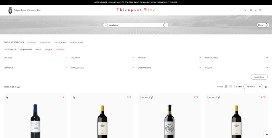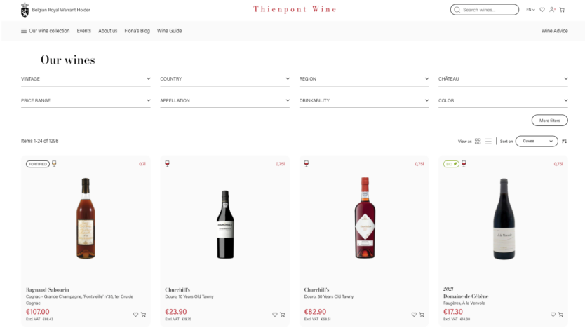 Opțiunile extinse de filtrare permit utilizatorilor să sorteze vinurile după tip, regiune, soi de struguri, producător, an, sau chiar asocierea cu alimente. Astfel navigarea prin selecția vastă a Thienpont este facilitată atât pentru cumpărătorii ocazionali, cât și pentru cunoscători. Platforma oferă, de asemenea, două moduri de vizualizare distincte: vizualizare în listă și vizualizare în galerie.